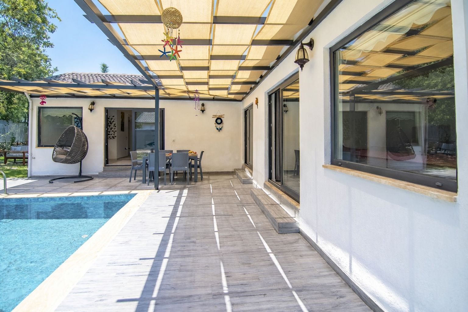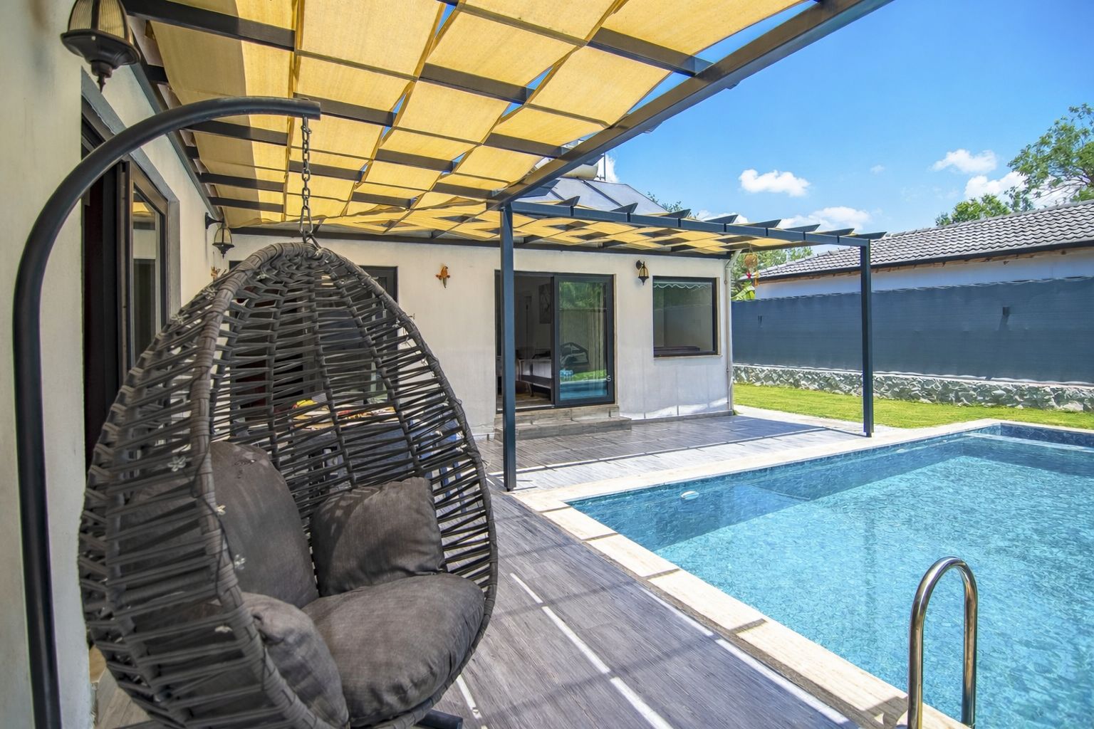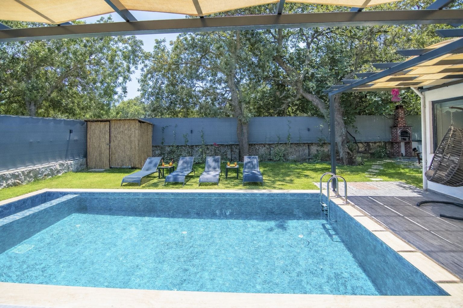 Keyif Alanları: Geniş güneşlenme terası, konforlu şezlonglar, salıncak ve akşam sefaları için özel barbekü alanı.